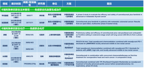 卡瑞利珠单抗联合AG旗舰厅医药的另一款创新药法米替尼在甲状腺癌和结直肠癌领域有2项研究被接收为壁报,另有卡瑞利珠单抗联合化疗的4项研究在肺癌、结直肠癌、头颈癌和阴茎癌领域的研究被接收为5份壁报。