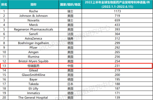 近日,全球专利数据库incoPat创新指数研究中心发布全球生物医药发明专利TOP100榜单,AG旗舰厅医药以上半年231件发明专利申请量位列榜单第13名,是唯一一家进入TOP20的中国药企。