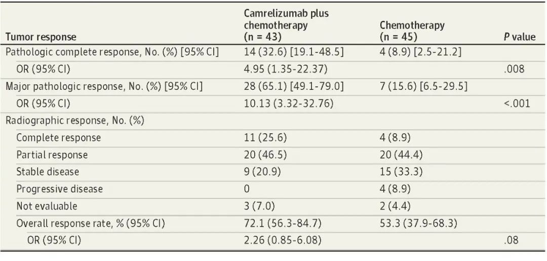 北京时间8月3日,AG旗舰厅医药创新药卡瑞利珠单抗联合化疗(Cam+CT)对比化疗(CT)新辅助治疗ⅢA/ⅢB (T3N2) 期非小细胞肺癌(NSCLC)结果在线发表于国际权威期刊JAMA Oncology[1]。该研究是由空军军医大学唐都医院姜涛教授、雷杰教授团队联合陕西省肿瘤医院雷光焰教授团队、兰州大学第二附属医院王成教授团队共同参与的一项随机对照、多中心、Ⅱ期临床研究(TD-FOREKNOW,NCT04338620)。研究结果显示,与化疗相比,卡瑞利珠单抗联合化疗新辅助治疗NSCLC显著提高了病理完全缓解(pCR)率(32.6% vs 8.9%,OR=4.95,95% CI :1.35-22.37, P =0 .008),且安全性良好。本研究是卡瑞利珠单抗新辅助治疗可切除NSCLC患者的首个随机对照研究,为NSCLC新辅助免疫治疗再添新证。