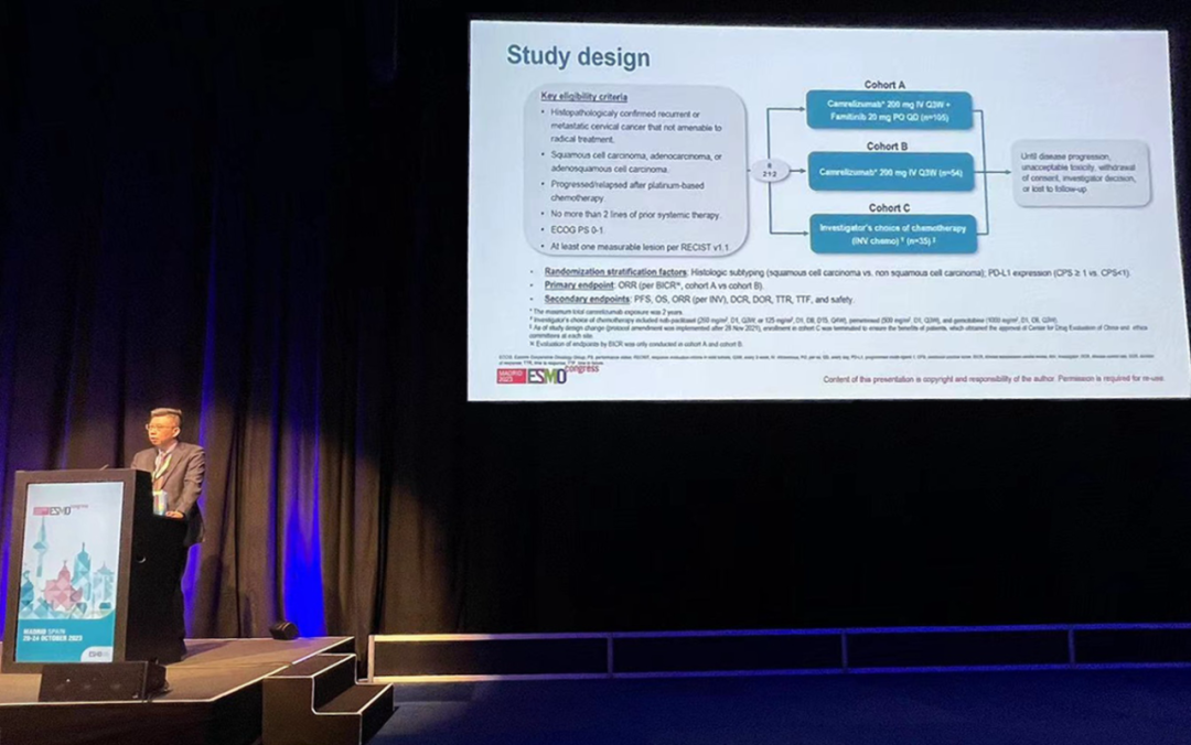 有望为宫颈癌患者带来治疗新选择10月22日,AG旗舰厅医药创新药卡瑞利珠单抗联合法米替尼对比卡瑞利珠单抗单药或研究者选择的化疗治疗复发转移性宫颈癌随机、开放、对照、多中心的Ⅱ期临床研究(SHR-1210-Ⅱ-217) 亮相2023 ESMO大会简短口头报告现场3。该研究由复旦大学附属肿瘤医院吴小华教授团队开展,吴小华教授在现场公布了该重磅研究进展。研究结果显示,在既往以铂为基础化疗失败后复发或转移性宫颈癌患者中,与单独使用卡瑞利珠单抗或研究者选择的化疗相比,卡瑞利珠单抗联合法米替尼显著提高了抗肿瘤活性,安全性可控,有望为晚期宫颈癌患者提供新的治疗选择。